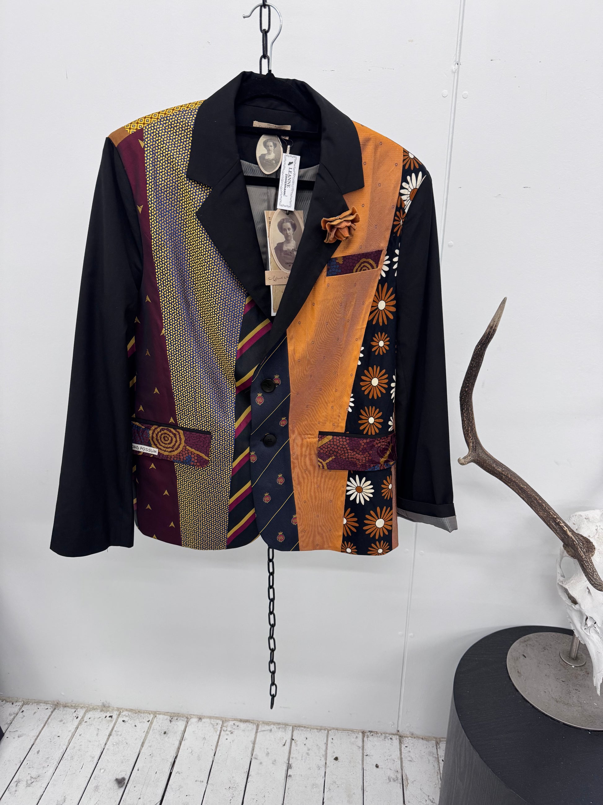 These Blazers are individually hand selected put together with Vintage ties collected from across the world to achive this beautifully crafted Blazer, with a vintage brooch on the laple.