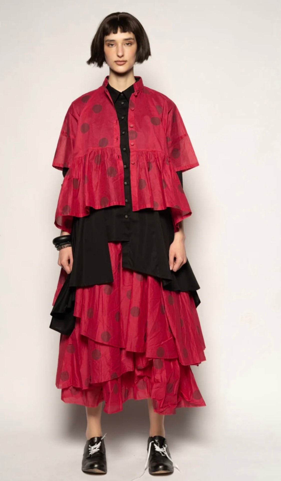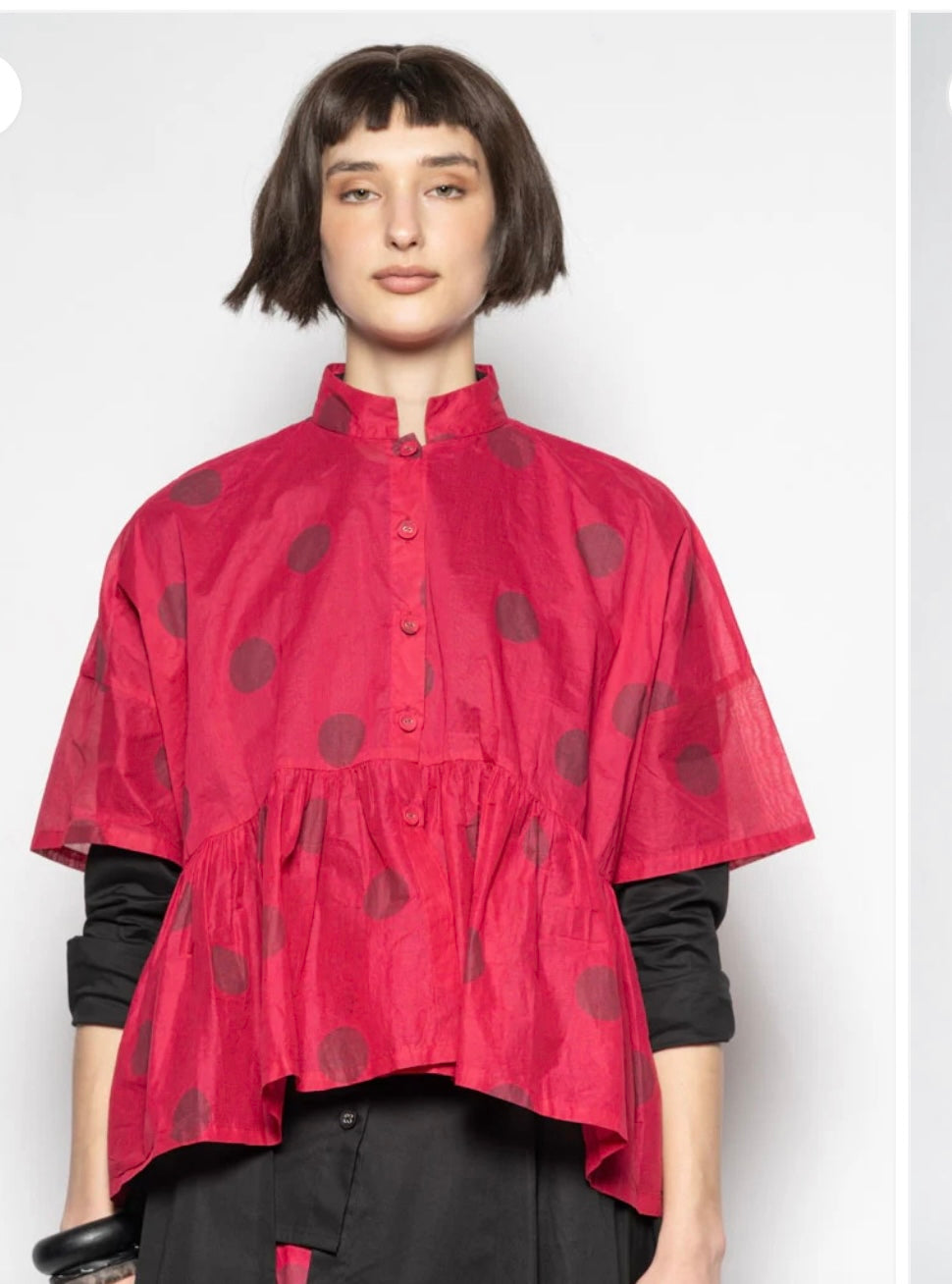 Cut in airy cotton organdy with our gentle dot motif, it skims the shoulders and falls into a soflty gathered peplum that moves with you. A neat mandarin collar and delicate button front invite you wear it closed as a blouse or open as a little jacket..